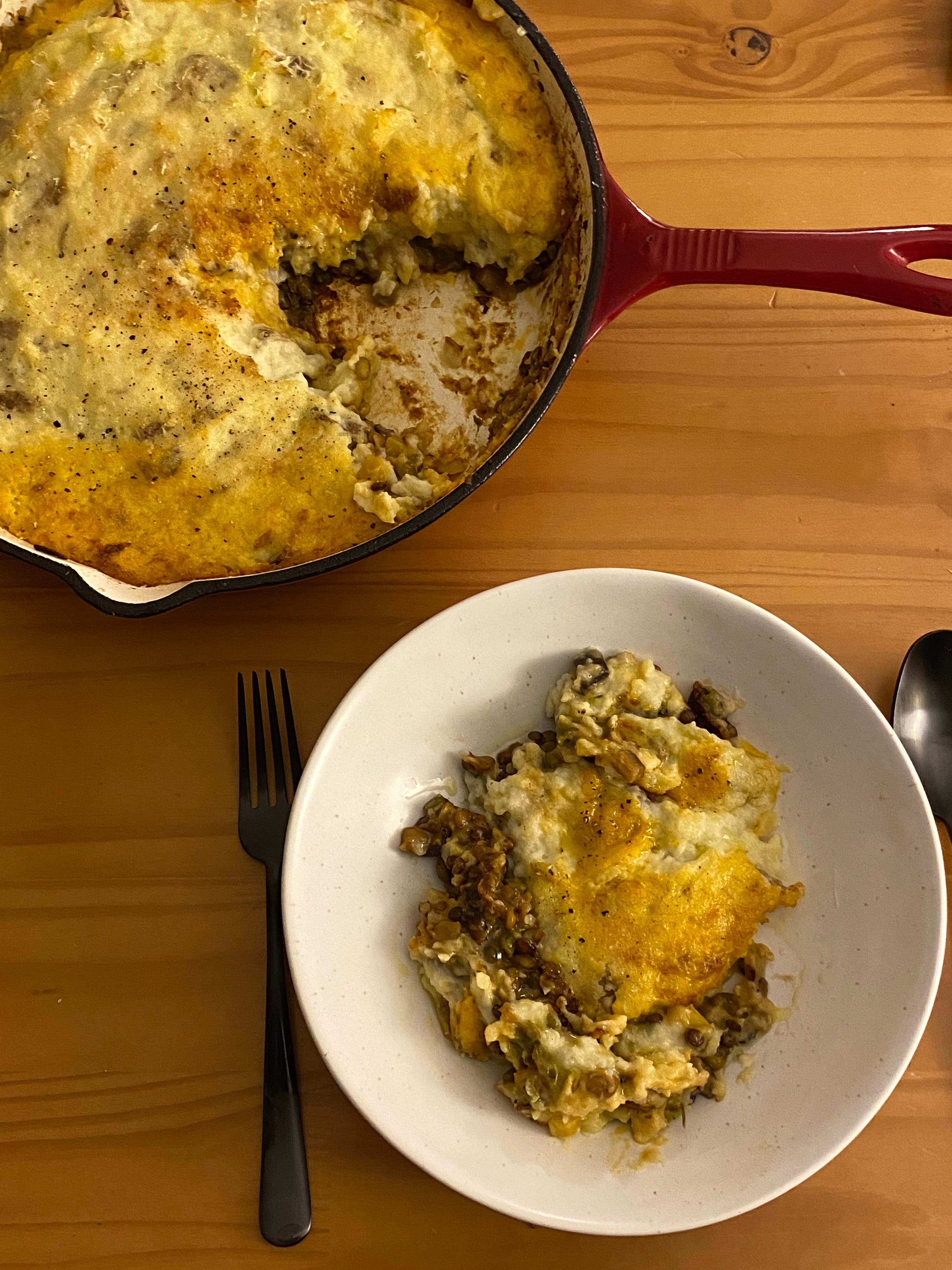 I wanted my version to be flexible and forgiving so that you can make it with items you may already have in your pantry/fridge/freezer, making it a simple dish to prepare when coming home after a long time. I found the original recipe a little confusing with the amount of back and forth between filling and topping, which I think is a little unnecessary for a humble dish like shepherd’s pie (the only type of humble pie I enjoy). When you’re exhausted and drained, the last thing you want is too many steps. I’ve cut down the excess by merging a few steps (the filling gets made all at once while the potatoes are boiling, rather than cooking the lentils first before combining with the rest of the ingredients). I hope you enjoy.