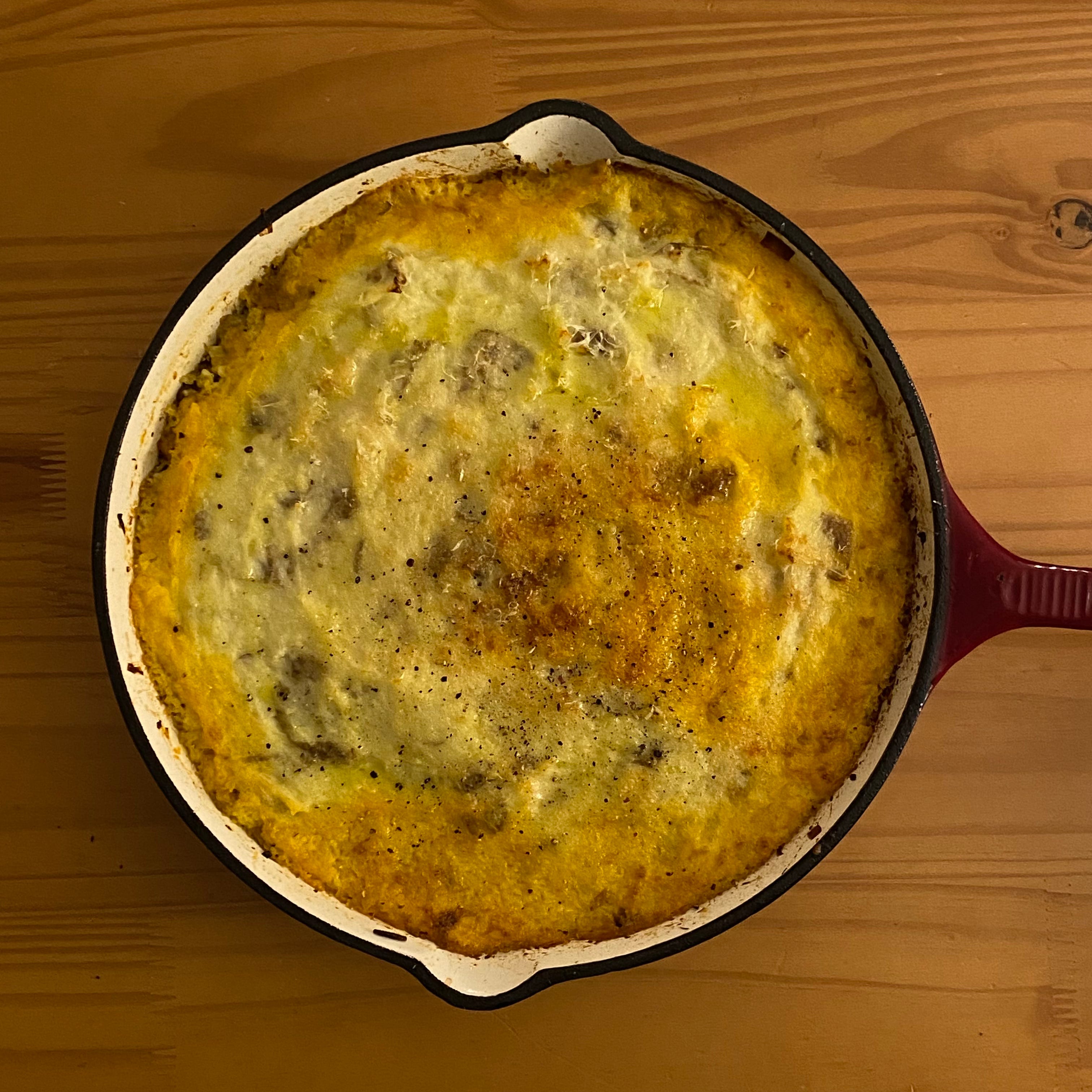 Spread the mashed potatoes evenly over the filling. Sprinkle the Parmigiano over the topping, then bake for about 30 minutes, until the potatoes are browning and the pie is bubbling on the edges. Let the pie rest at room temperature for about 30 minutes and resist the urge to eat the pie right away. Indulge.
